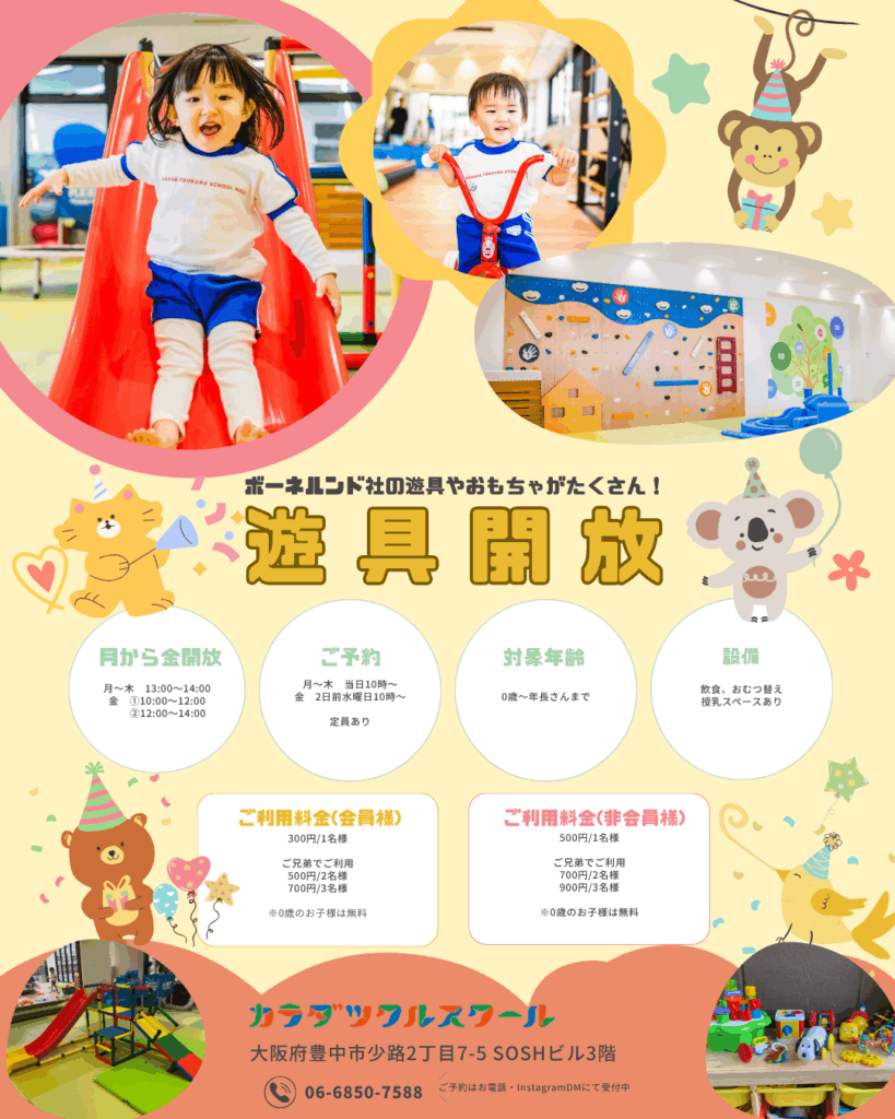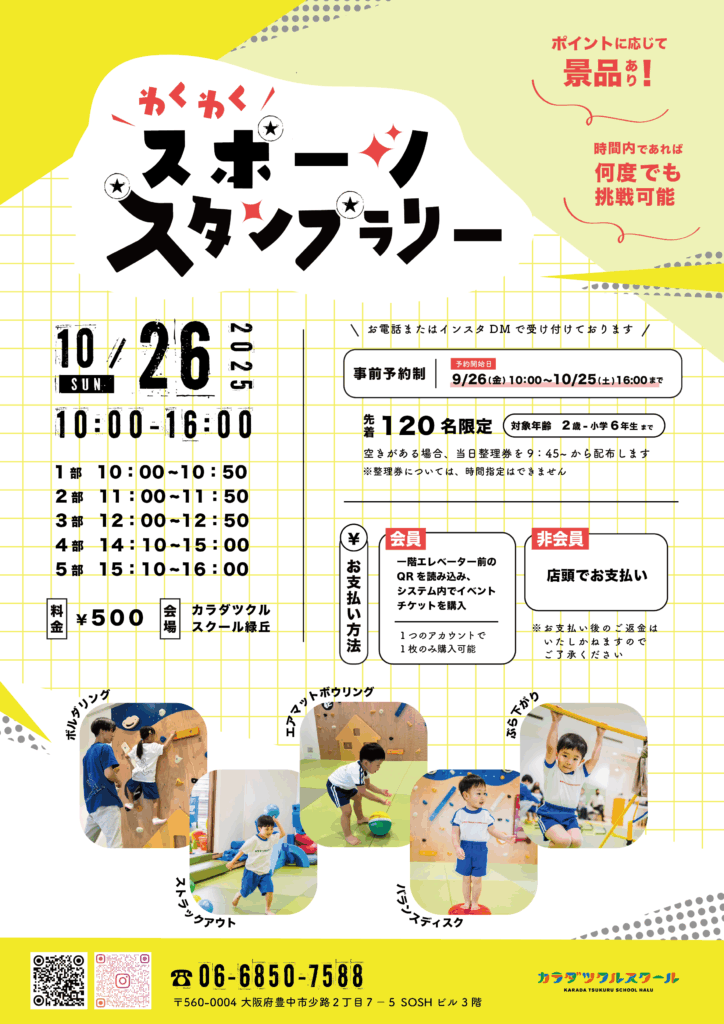 【開放日】月曜日〜木曜日→13:00〜14:00 金曜日→①10:00〜12:00→②12:00〜14:00 【ご予約】月曜日~木曜日:当日の10:00より予約受付開始金曜日:2日前の水曜日の10:00より予約受付開始ご予約は電話またはInstagramDMにてTEL 06-6850-7588 定員あり 【対象年齢】0歳〜年長 【料金】●会員様300円/1名様 ご兄弟でご利用500円/2名様700円/3名様 ●非会員様500円/1名様 ご兄弟でご利用700円/2名様900円/3名様 ※0歳のお子様は無料でご利用いただけます。 【設備】飲食、おむつ替え、授乳スペースあり ※スタッフはご案内のみとなる為、お子様の安全管理は保護者様にお願いしております。 ご予約お待ちしております✨ Instagramはこちら イベントわくわくスポーツスタンプラリー